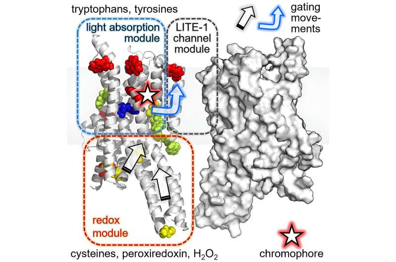 他們發(fā)現(xiàn),除其他外,形成通道的氨基酸的替換導(dǎo)致LITE-1的功能完全喪失。其他突變實(shí)驗(yàn)揭示了蛋白質(zhì)可以與H相互作用的位點(diǎn)2O2還發(fā)現(xiàn)了一種中心氨基酸,它似乎負(fù)責(zé)吸收紫外線產(chǎn)生的能量。