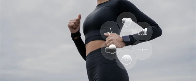 圖片中一位女性戴著智能手表,使用跑步時的心率和脈搏傳感器。