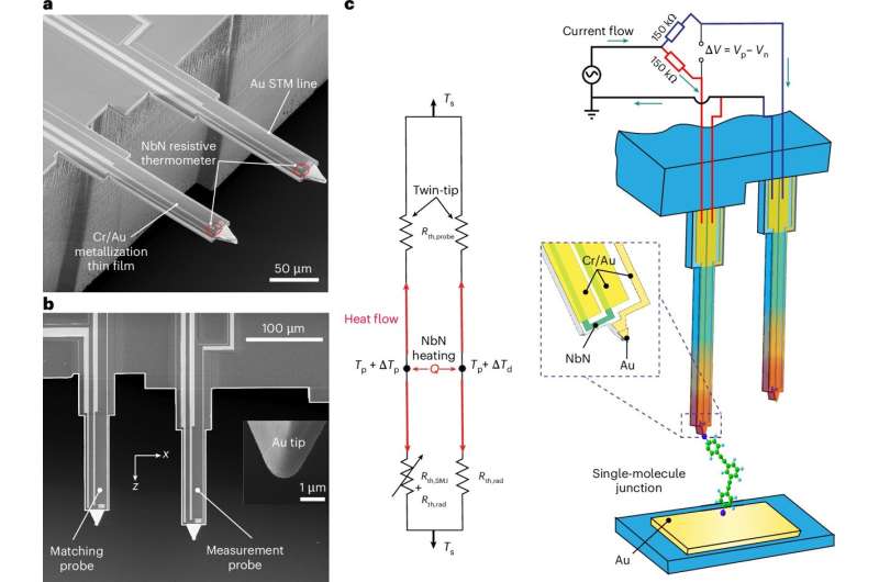 用于單分子熱測(cè)量的雙尖端氮化鈮掃描熱顯微鏡(SThM)探針。a. 雙尖端掃描熱顯微鏡探針的掃描電子顯微鏡(SEM)圖像(側(cè)視圖),在兩個(gè)幾何形狀相同的梁上有氮化鈮溫度計(jì),并配有用于電流測(cè)量的鉻 / 金金屬化層和金電極線。b. 探針的掃描電子顯微鏡圖像(俯視圖),顯示了雙尖端的接近程度(在 z 方向上偏移 20 微米)。插圖:鍍金尖端的末端。c. 用于量化單分子結(jié)熱導(dǎo)率的測(cè)量方案示意圖,單分子結(jié)被困在金樣品和雙尖端探針的較長尖端之間。使用全惠斯通電橋電路來測(cè)量由通過分子結(jié)的熱流引起的兩個(gè)尖端之間的溫差。一個(gè)熱阻網(wǎng)絡(luò)展示了從探針到散熱器的熱流(Q)路徑。這里 Rth,SMJ=1/Gth,SMJ,Rrad 是與環(huán)境的輻射熱阻。圖片來源:《自然材料》(2025 年)。DOI: 10.1038/s41563-025-02195-w