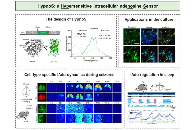 這種名為 “超靈敏細胞內腺苷傳感器”(Hypersensitive intracellular adenosine Sensor, HypnoS)的工具,能夠在活體動物大腦中以高時空分辨率監測癲癇發作或睡眠 - 覺醒周期中的 iAdo 動態變化。
