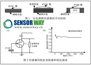 壓電薄膜傳感器的設(shè)計(jì)主要考慮了傳感器的靈敏度 和信噪比,根據(jù)測量信號的頻率和響應(yīng)幅度,我們設(shè)計(jì) 薄膜傳感器的結(jié)構(gòu)有如同圖1所示的幾種。在采集人體 心音的信號時(shí),由于心音的頻響范圍較寬,同時(shí)其輸出 的物理信號值也很微弱,采用硬質(zhì)襯底和中空的設(shè)計(jì)。 這樣可以提高傳感器中薄膜在收到心音信號時(shí)的形變 量,從而提高信號強(qiáng)度。這樣結(jié)構(gòu)設(shè)計(jì)的缺點(diǎn)是結(jié)構(gòu)不牢固,使用時(shí)間長了需要校正。