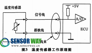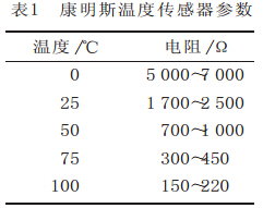 電控柴油發(fā)動(dòng)機(jī)上使用的溫度傳感器為二線式熱敏式溫度傳感器, 其外形如圖2所示。隨著溫度的升高, 熱敏電阻的阻值降低, 正常情況下阻值在500Ω~40kΩ之間變化, 表1所示為一個(gè)典型的康明斯溫度傳感器參數(shù), 具體參數(shù)值請(qǐng)參照隨電路圖提供的傳感器技術(shù)參數(shù)表。圖3為溫度傳感器的工作原理圖。隨著溫度的升高, 熱敏電阻值降低, 從而使信號(hào)電壓降低, 根據(jù)溫度傳感器的工作原理, 可以用檢查熱敏電阻阻值的方法檢查溫度傳感器, 通過對(duì)比實(shí)際測(cè)量所得的電阻值和參數(shù)表中的電阻值, 來判斷溫度傳感器是否正常。