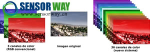 左:傳統傳感器只能記錄RGB三通道色彩數據,最后合成彩色照片,右:TFD傳感器則可記錄36通道色彩數據