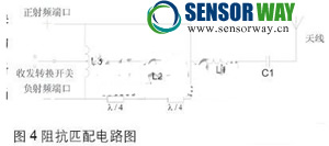 CC2430的射頻信號采用差分方式,其最佳差分負(fù)載阻抗是115+j180Ω,阻抗匹配電路需要根據(jù)這一數(shù)值進(jìn)行調(diào)整。本設(shè)計采用50歐姆單極子天線,由于CC2430的射頻端口是差分形式具有兩個端口,而天線是單端口,因此需要一個巴倫來完成兩端口到單端口間的轉(zhuǎn)換。巴倫電路由成本低廉的電感和電容構(gòu)成,如圖4所示,包括電感L1、L2、L3和電容C1和兩段長的傳輸線。