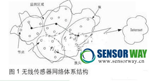 在無線傳感器網(wǎng)絡(luò)中,節(jié)點任意散落在被監(jiān)測區(qū)域內(nèi)。節(jié)點以自組織形式構(gòu)成網(wǎng)絡(luò),通過多跳中繼方式將監(jiān)測數(shù)據(jù)傳到Sink節(jié)點,最終借助長距離或臨時建立的Sink鏈路將整個區(qū)域內(nèi)的數(shù)據(jù)傳送到遠(yuǎn)程中心進(jìn)行集中處理。圖1給出了一般形式的無線傳感器網(wǎng)絡(luò)體系結(jié)構(gòu)[3]。