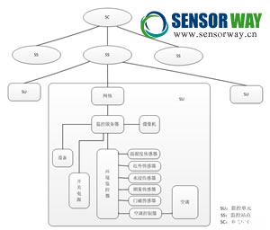 動(dòng)力環(huán)節(jié)監(jiān)測(cè)系統(tǒng)應(yīng)用在機(jī)房、基部站等無人值守的環(huán)境中,對(duì)局站內(nèi)的通訊電源、蓄電池組、UPS、發(fā)電機(jī)、空調(diào)等智能、非智能設(shè)備以及溫濕度、煙霧、地水、門禁等環(huán)境量實(shí)現(xiàn)“遙測(cè)、遙信、遙控、遙調(diào)”等功能。為了實(shí)現(xiàn)對(duì)多個(gè)量的監(jiān)測(cè),動(dòng)環(huán)系統(tǒng)集成了各種類的傳感器,是多傳感器集成系統(tǒng)傳感器“多類型”的一個(gè)經(jīng)典案例。同時(shí),此監(jiān)控系統(tǒng)充分利用了通訊傳輸設(shè)備所能提供的各種傳輸信道資源,可以實(shí)現(xiàn)多級(jí)網(wǎng)管,能夠?qū)λ芯终镜娜珔?shù)、全方位的監(jiān)控,這又很好體現(xiàn)了多傳感器集成系統(tǒng)傳感器“多數(shù)量”的一面。動(dòng)環(huán)監(jiān)測(cè)系統(tǒng)的組成如下:
