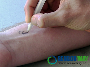 生物傳感器過(guò)皮膚讀取血糖指數(shù),并通過(guò)藍(lán)牙設(shè)備傳出結(jié)果。一支筆里的墨水可以寫(xiě)滿500張血糖傳感條。
