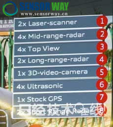 車輛的后方配置兩個(gè)近距離雷達(dá),前方和后方共配置四個(gè)中距離雷達(dá),前方配置兩個(gè)長(zhǎng)距離雷達(dá)。攝像頭方面,前方和后視鏡部分共配備四個(gè)俯視攝像頭(Top View Camera),前車窗(Front Window)部分配備一個(gè)三維(3D)攝像頭。此外,前方和后方共配置兩個(gè)激光掃描儀,后方配置四個(gè)超聲波傳感器以及一個(gè)GPS。