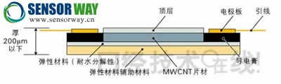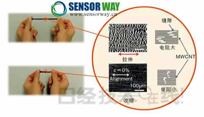 這種傳感器的開發(fā)源于鈴木到靜岡大學從事碳納米管(CNT)研究。其中重要的研究就是多層管結(jié)構(gòu)“MWCNT(multi wall CNT)”。普通CNT的長度為μm級,呈粉末狀或分散液狀態(tài),而靜岡大學開發(fā)的MWCNT長度為mm級,呈長纖維狀。MWCNT在基板上生長到足夠大以后,用鑷子等工具對其進行拉伸,可以將MWCNT作為片材取出。